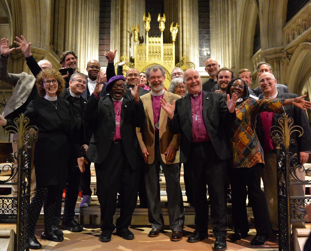L’ensemble du clergé présent le 24 mars, premier rang de gauche à droite : la Rev. Sunny Hallanan (All Saint’s Waterloo, Belgique), Doyen de la Cathédrale par intérim Tim Safford, l’Evêque Président Michael Curry, l’Evêque en charge Mark Edington, l’Archevêque de York Stephen Cottrell, la Chanoine pour l’évangélisation et la réconciliation Stephanie Spellers, le très Rev. W. Michie Klusmeyer. Derrière, de gauche à droite : l’Archidiacre Walter Baer, le Chanoine de la Cathédrale Nat Katz, notre Rev. Jean Dumond Chavanne, le Rev. Dr. Francisco Alberca (St. Paul’s Within the Walls, Rome), la Rev. Katie Osweiler (All Saint’s Waterloo, Belgique), le Rev. Clair Ullmann (Church of the Ascension, Munich), le Rev. Dr. Peter Lindvall, le très Rev. Dr. Christopher Meakin, le Rev. Gregory Stark, l’ancien doyen de la Cathédrale Zachary Fleetwood, le diacre Richard Cole. (C) The American Cathedral